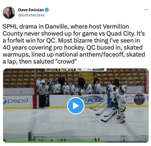 I love me some minor league hockey drama, having killed a couple teams in my own right. The Vermilion County Bobcats of the low tier Southern Professional Hockey League no showed for their own HOME game. Dave Eminian of the Peoria Journal-Star notes that visiting Quad City took warmups, lined up for the national anthem and faceoff, skated a lap then saluted the crowd and was awarded the win. The Bobcats have nine wins in two years and are drawing less than 400 fans per game, while having just 10 players left.