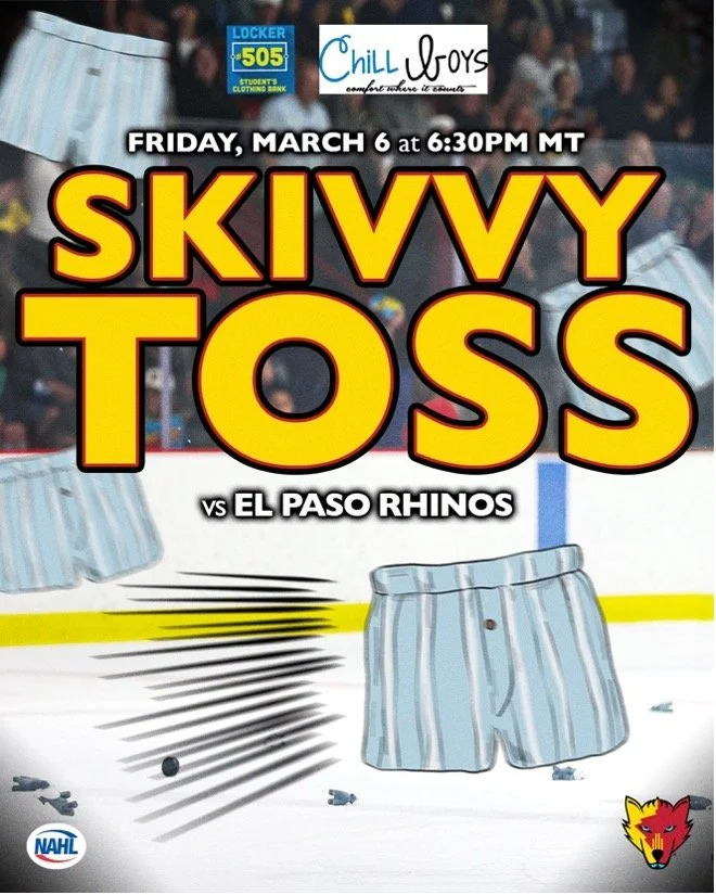 The Skivvy Toss goes like this — hockey fans are asked to bring as many new packages of boy’s and girl’s underwear as they can to the game to be tossed onto the ice for a chance to win a prize. As the inventors, the Ice Wolves are skivvy toss pioneers in the sport of hockey. Once it’s tossed on the ice Chuck-a-Puck style, the underwear is collected and donated to Locker #505 Student Clothing Bank. The 501(c)(3) nonprofit in Albuquerque, New Mexico, provides school clothing to local K-12 students in need. For the past few years, underwear brand Chill Boys generously donated hundreds of pairs of underwear each year to the cause, helping the Ice Wolves give back to their community. Delivering “comfort where it counts” as Chill Boys tagline states.