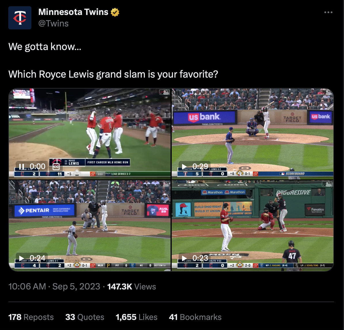 Lewis is 24 years old and on his way to stardom. And it’s easy to forget - despite us all knowing - what he’s overcome. In 2020 there were no minor leagues due to Covid-19. In 2021 he blew out his knee. Again in 2022, while the Twins experimented with him in centerfield and he blew out his knee again.