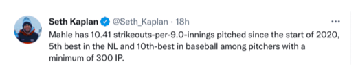 Mahle? He may not be a No. 1 starter -at least consistently -but he’s going to be a solid second or third option behind Joe Ryan. He’s only 5-7 this season -but Cy Young may be 5-7 on that Reds team. Mahle is durable -he led the majors with 33 starts last season while striking out 210, a number only Johan Santana has reached in recent memory. And, Mahle isn’t a free agent until 2024.