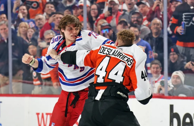 After only being in the league for a little over a week and playing in five games for the New York Rangers, 21-year-old Matt Rempe has already been in three fights against Matt Martin, Nicolas Deslauriers and Mathieu Olivier. At 6-foot-8 ½ on skates and 241 pounds, Rempe has put on some of the best old-school hockey fights where the only thing that seems to be missing is tinfoil on the knuckles. Hockey fans are loving every minute of it, but I think Rempe will have to take a little break from fighting after seeing his face at practice yesterday... and I thought Deslaurier’s face looked bad after the fight.